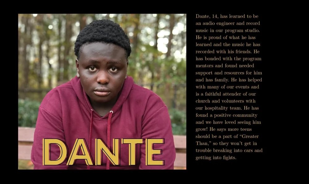 Dante, 14, has learned to be an audio engineer and record music in our program studio.He is proud of what he has learned and the music he has recorded with his friends. He has bonded with the program mentors and found needed support and resources for him and has family. He has helped with many of our events and is a faithful attender of our church and volunteers with our hospitality team. He has found a positive community and we have loved seeing him grow! He says more teens should be a part of "Greater Than," so they won't get in trouble breaking into cars and getting into fights.